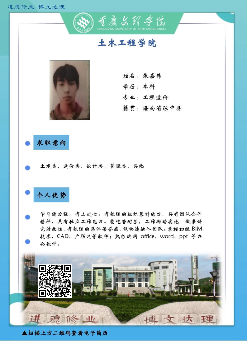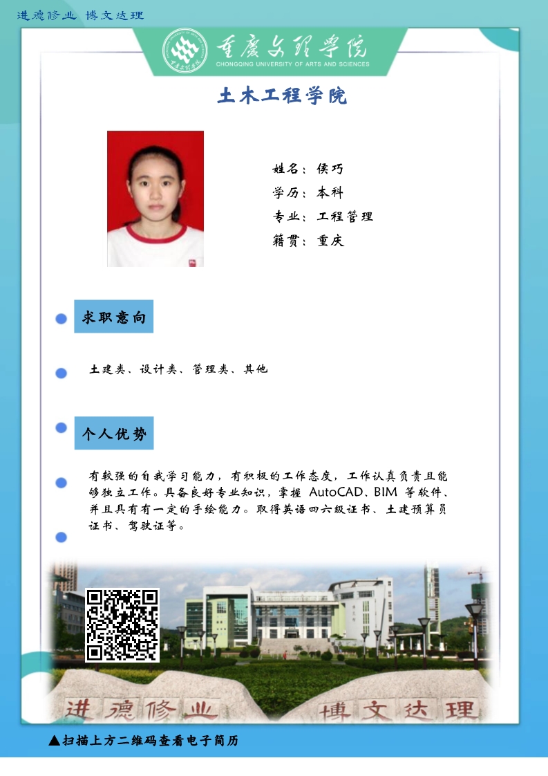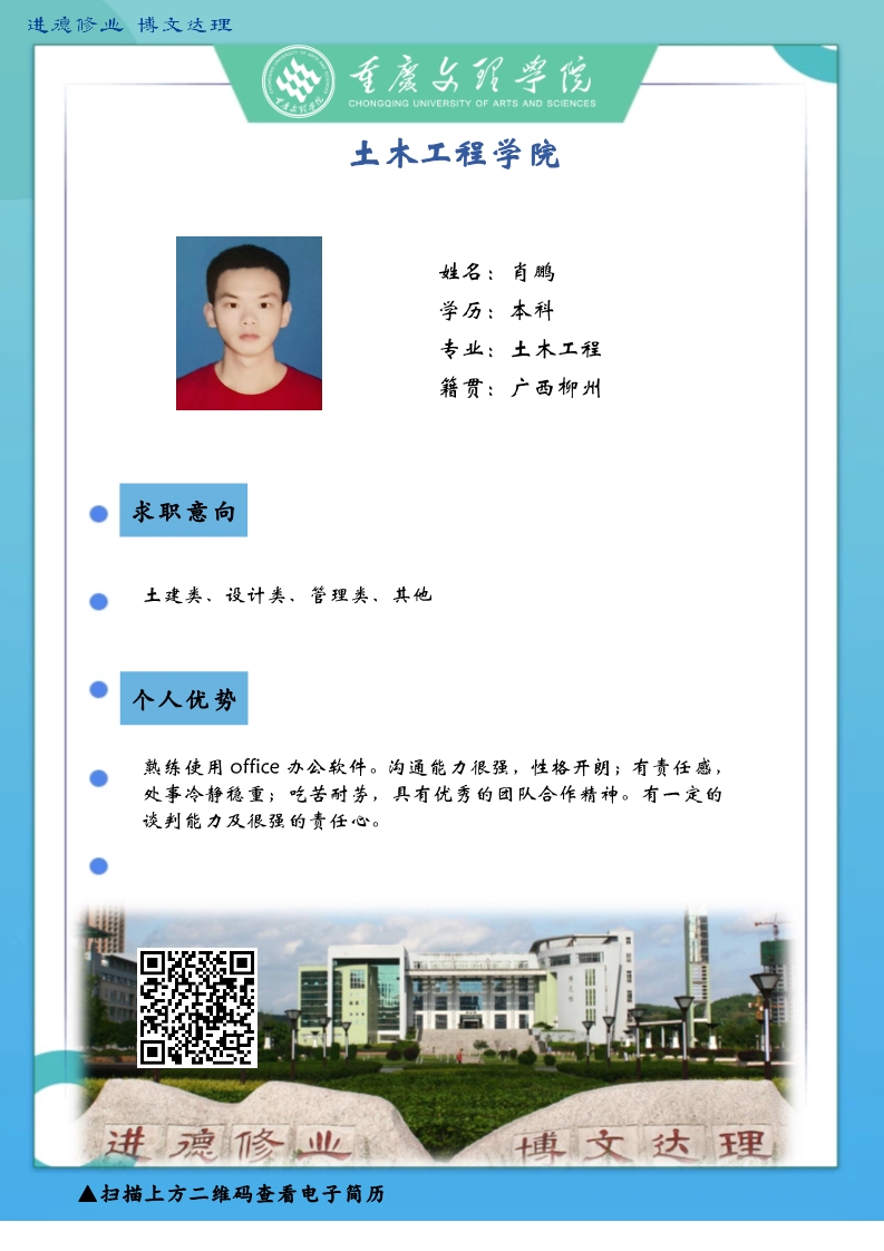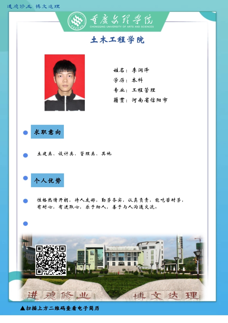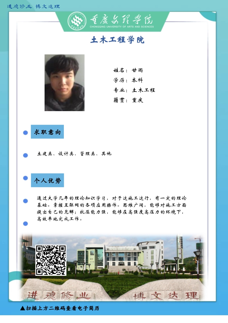 更是坚韧务实肯干,厚土承乾坤,众木支天下。线下招聘活动困难重重,不能当面向您推荐优秀人才,学生也不能当面向您自我介绍,特借此平台,把一些优秀毕业生信息线上发布,如果您或您的朋友有需求,请联系我们,说明单位名称、岗位基本信息和联系方式,我们会第一时间把学生简历呈上。待疫情过后,英才良驹助您事业兴旺发达,再展宏图新篇章!