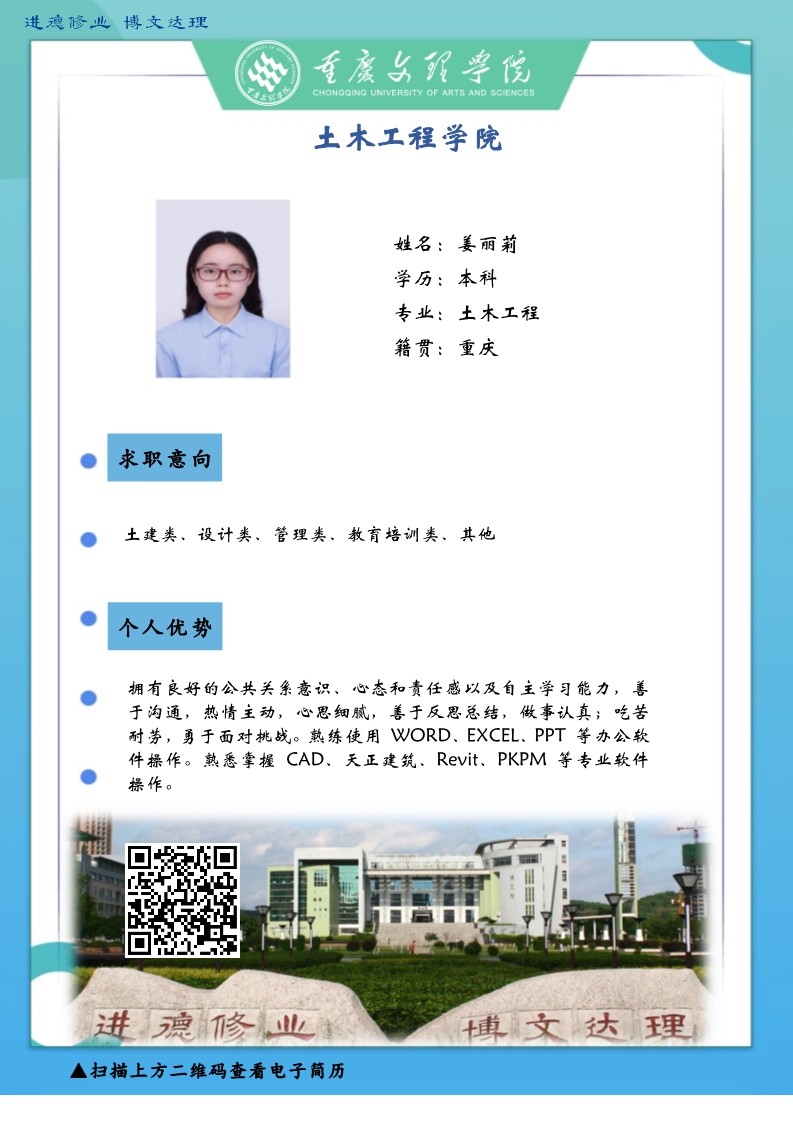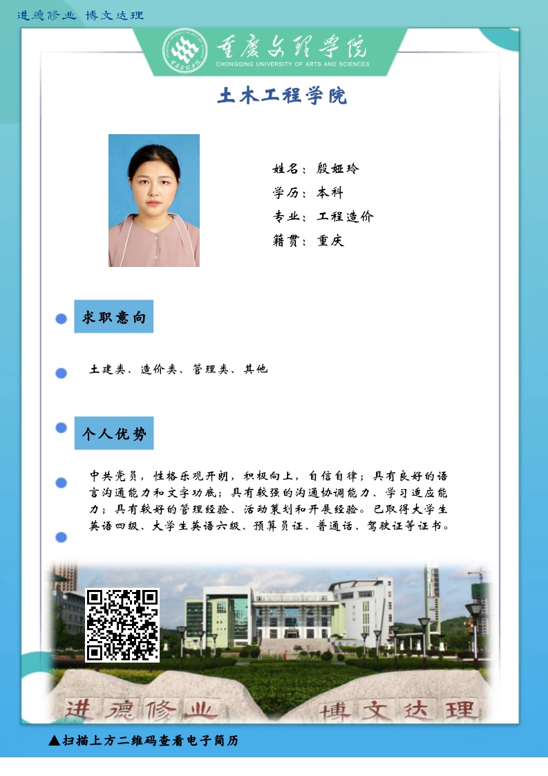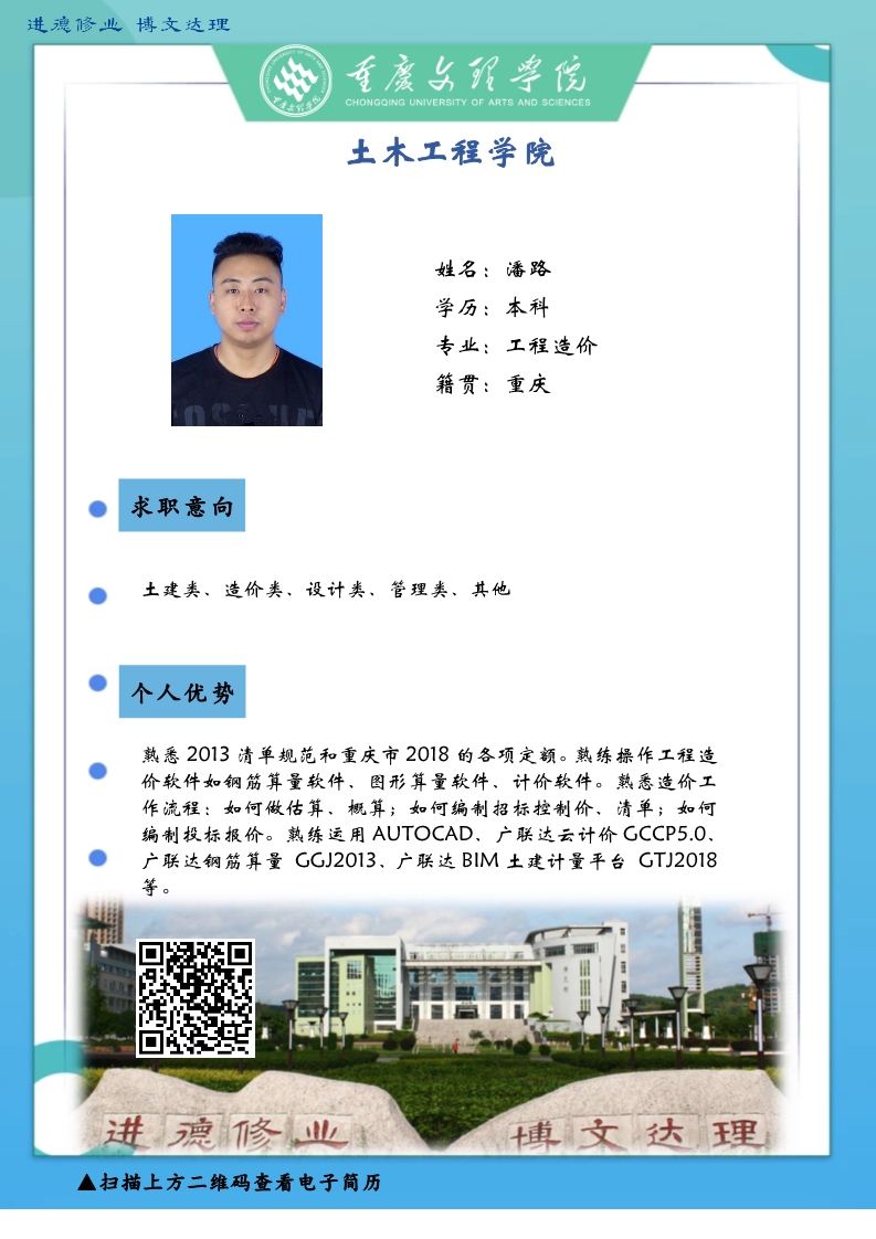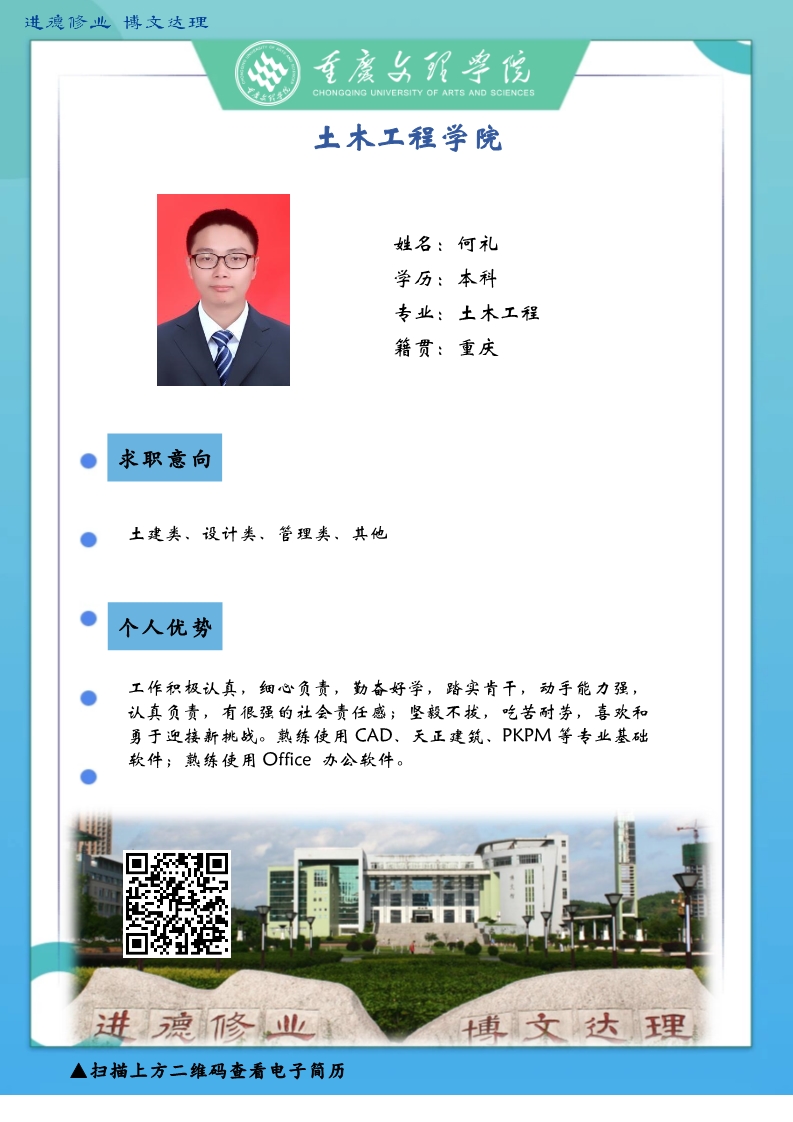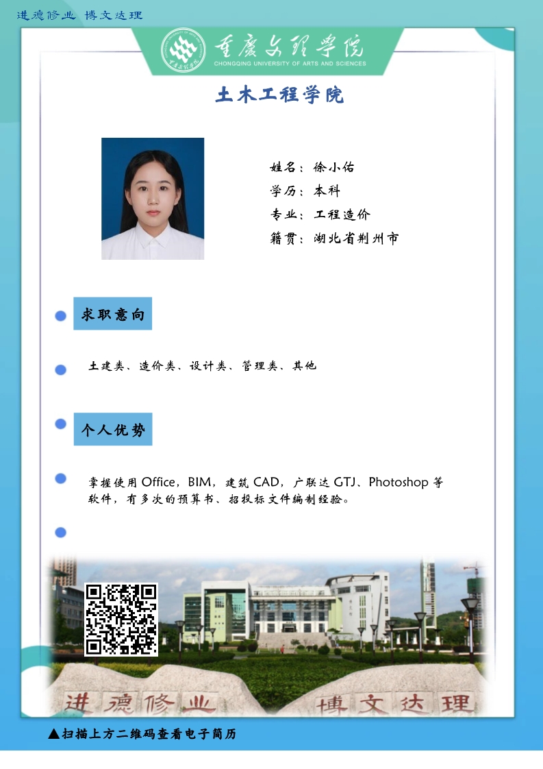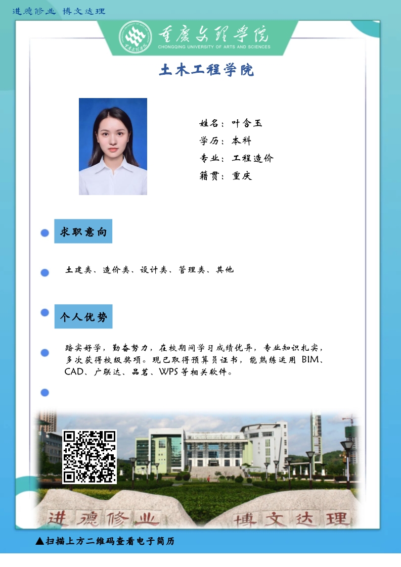 更是坚韧务实肯干,厚土承乾坤,众木支天下。线下招聘活动困难重重,不能当面向您推荐优秀人才,学生也不能当面向您自我介绍,特借此平台,把一些优秀毕业生信息线上发布,如果您或您的朋友有需求,请联系我们,说明单位名称、岗位基本信息和联系方式,我们会第一时间把学生简历呈上。待疫情过后,英才良驹助您事业兴旺发达,再展宏图新篇章!