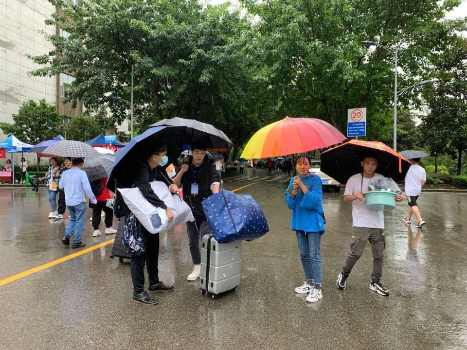 在踏入校门的那一刻起,新生们便要完成独立入校报到的必修课。在疫情防控的要求下,送新生的车辆和亲友不能入校,但学生志愿者们早已等候着新生的到来。不论是接站服务,还是完成报到手续,不论是行李搬运,还是食堂就餐,到处都有学长学姐们热情的身影。