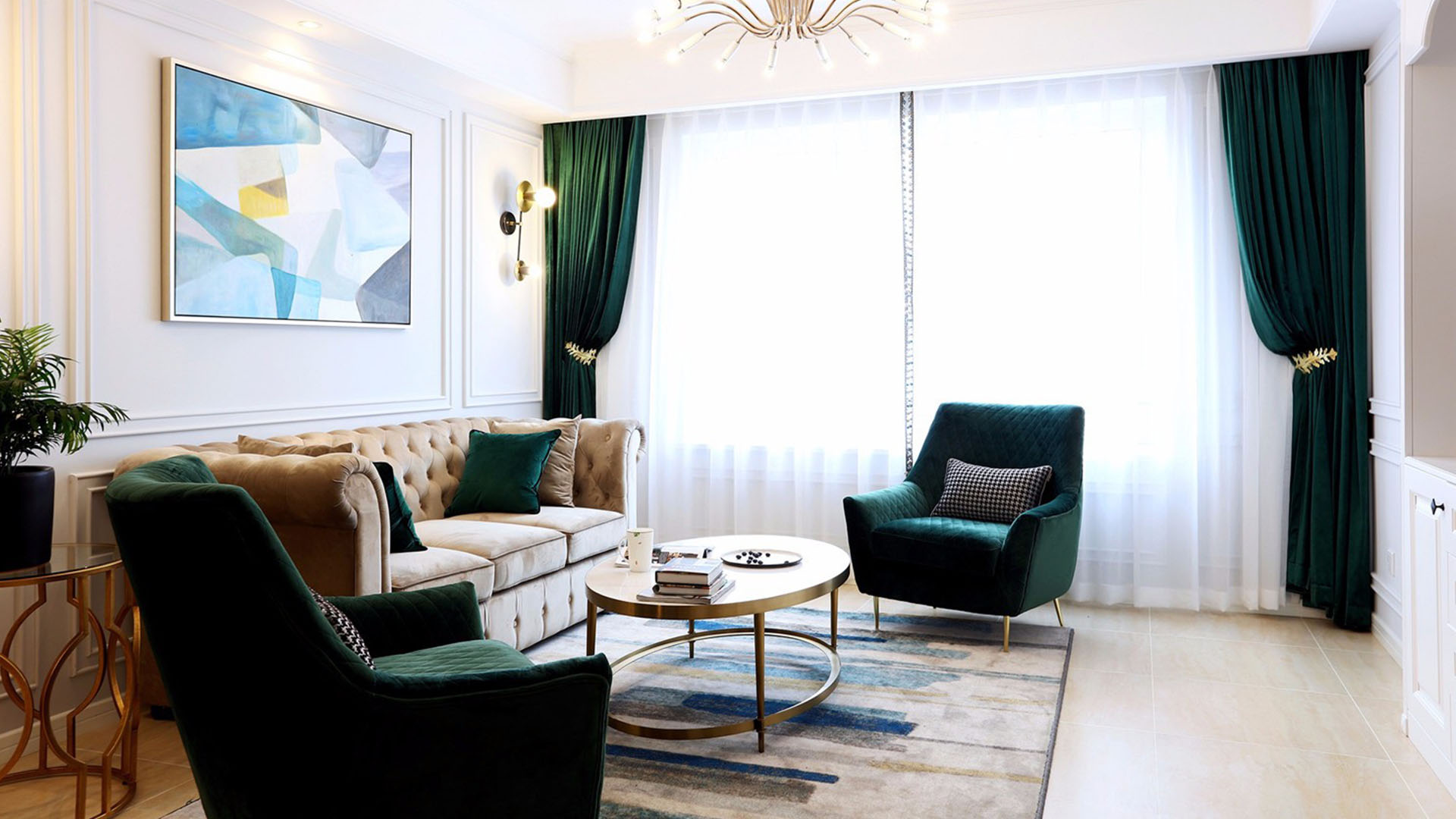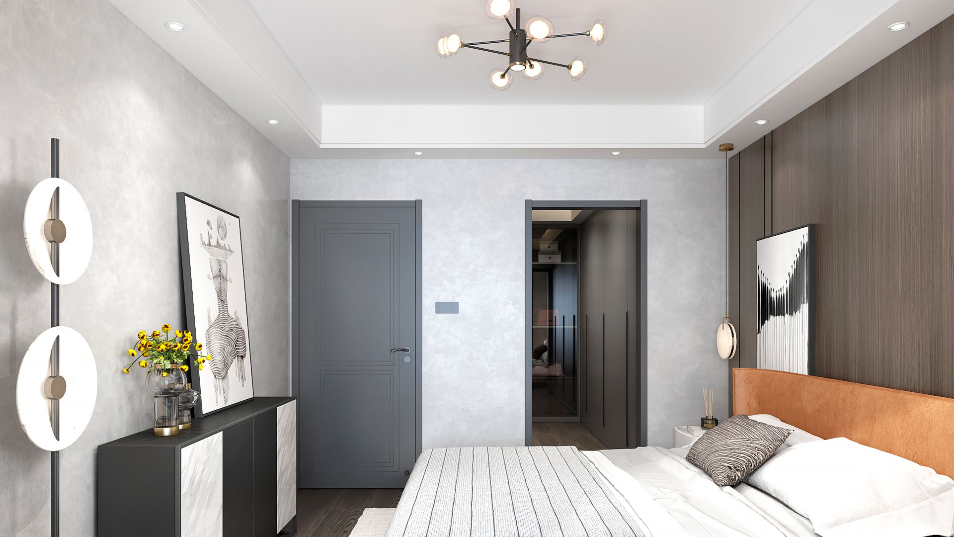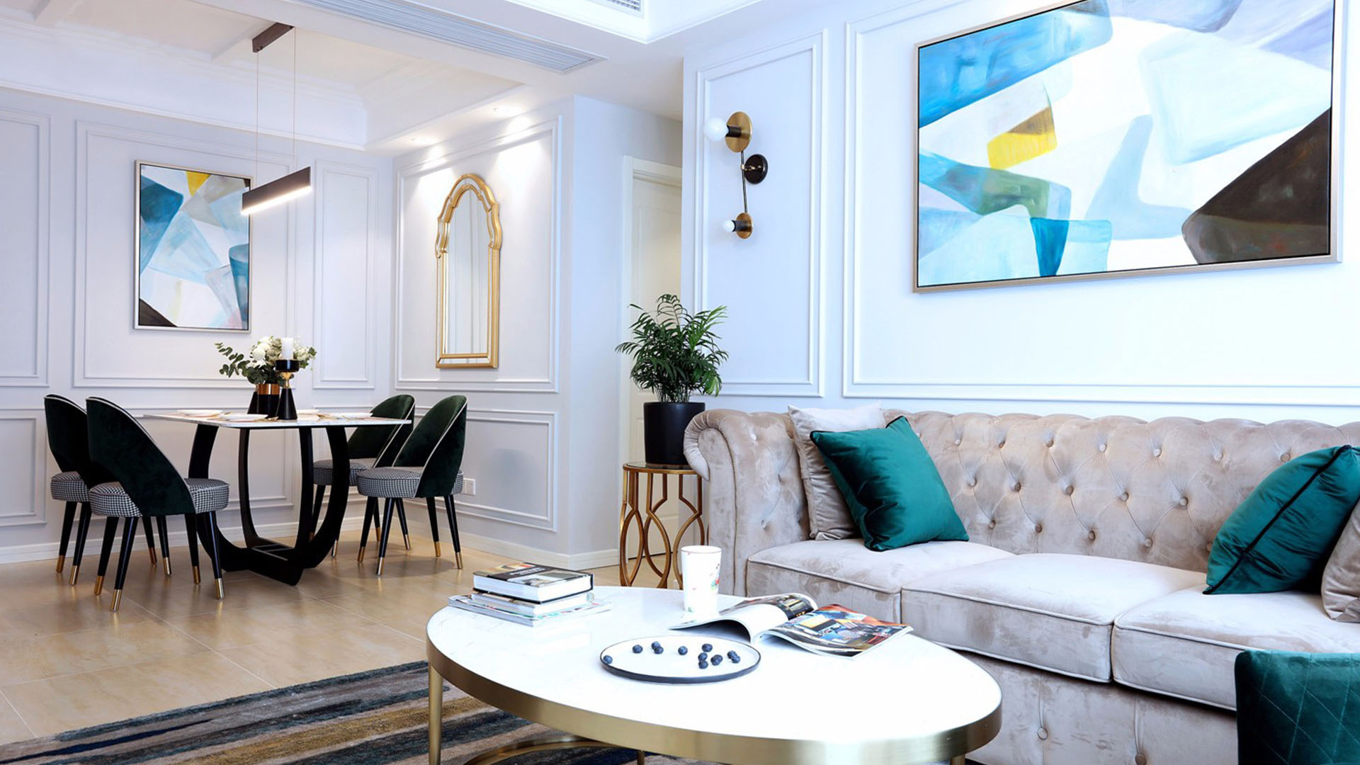 2021年3月13日,由我们工作室设计并装修的成都御景蓝湾1期北区2号房在绵阳市软装设计大赛获得一等奖,为我们工作室打响了名气。房间整体风格为轻奢风,获奖设计效果图如下: