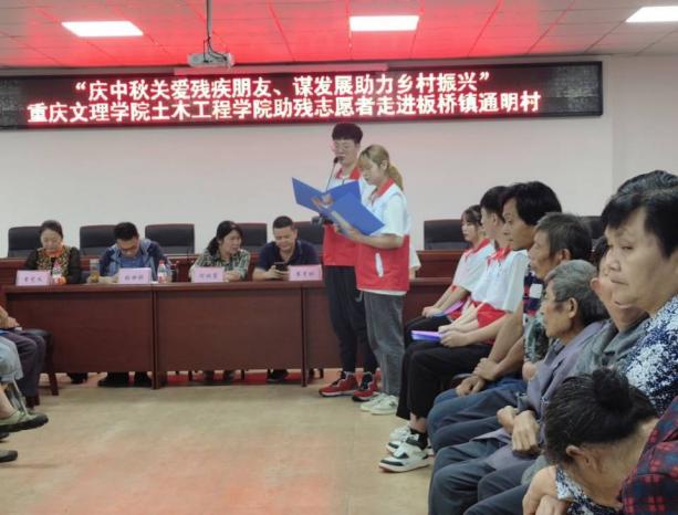 9月16日,为进一步深化党史学习教育,扎实做好“我为群众办实事”,弘扬扶残助残的传统美德,让残疾群体真正感受到节日氛围与温暖。在中秋佳节来临之际,我院联合永川区残联来到板桥镇通明村开展“庆中秋关爱残疾人朋友,谋发展助力乡村振兴”芬芳助残志愿者活动。永川区残联副理事长崔学彬、土木工程学院团总支书记左雨婷以及10余名学生党员志愿者参加此次活动。