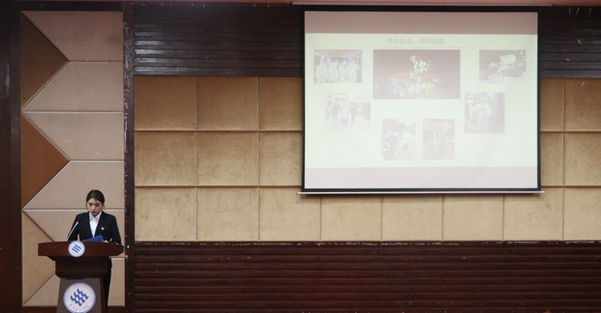 学生会执行主席操辉燕做上一学年的团学工作总结,其中包括齐心协力的共同抗疫、精彩纷呈的团学活动以及斩获各项殊荣的芬芳助残等各项工作。