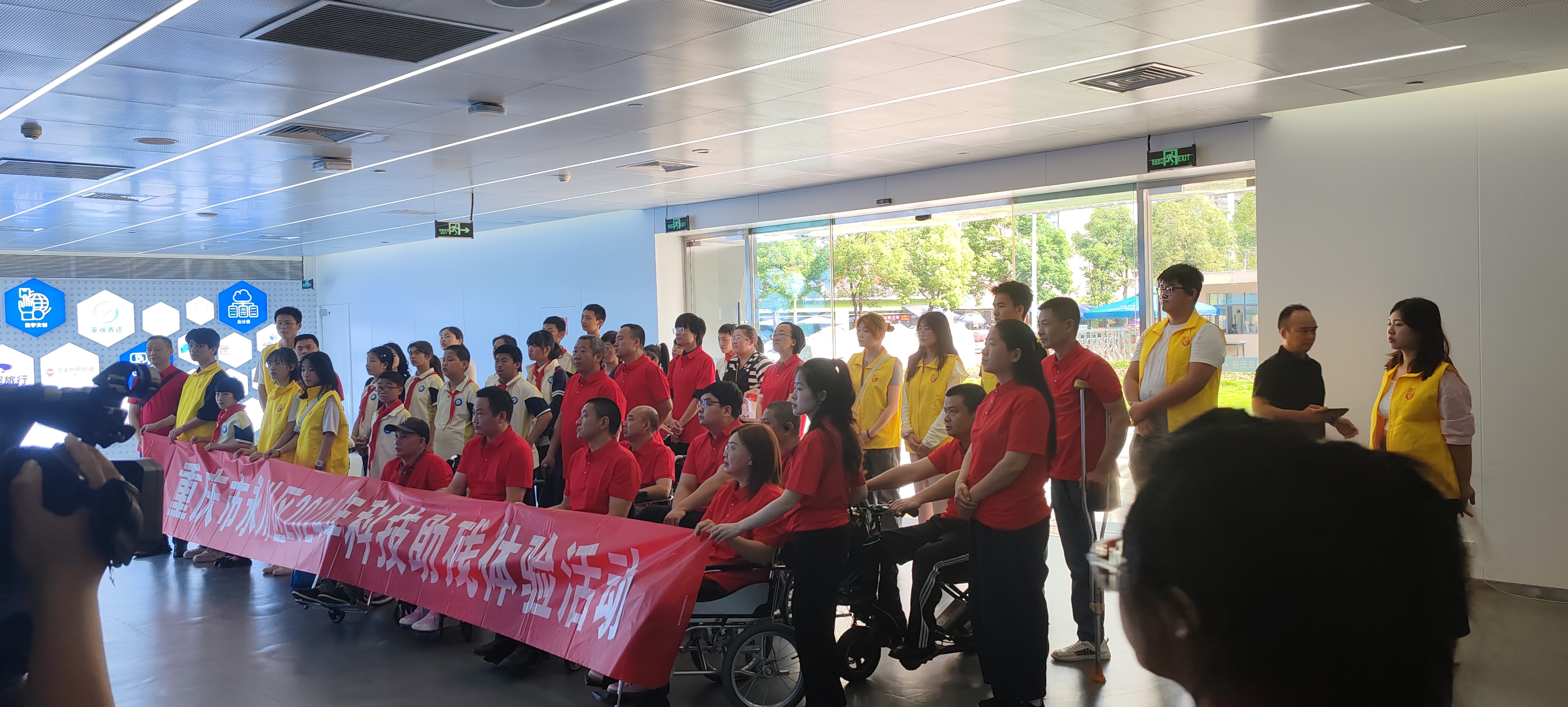 随后,志愿者与残疾人朋友们一同参观永川科技片场、会展中心,感受高科技电影制作和元宇宙技术,负责人为大家讲解了近期科技成果,残疾小朋友们和志愿者共同体验模拟跳楼拍摄片段,全方位了解高科技是如何改变我们的生活,探索航天科技的无限魅力。