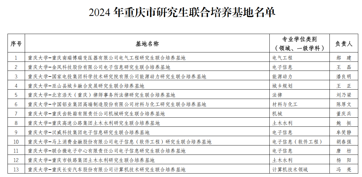日前,重庆市教育委员会发布《关于公布2024年研究生联合培养基地名单的通知》(渝教研发〔2024〕9号),我院申报的“mansion88明升-中交世通重工(重庆)有限公司土木水利研究生联合培养基地”成功获批。
